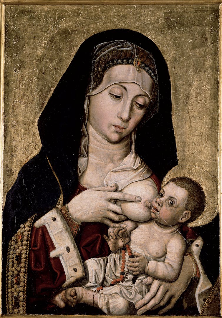 Right here, the naked breast doesn’t provoke outrage as a result of it’s maternally focussed – the Mary feeding the newborn Jesus – and the mom is a virgin.